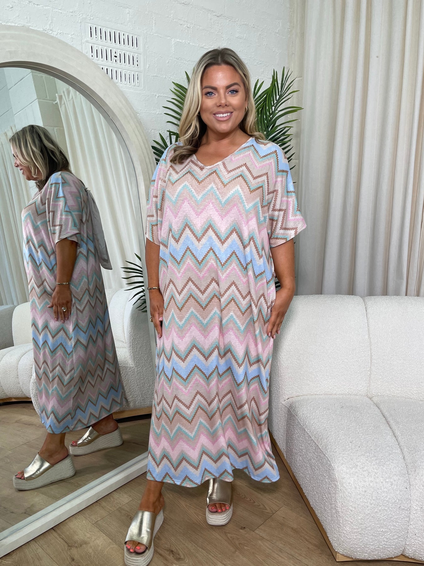 Darina Beige ZigZag Oversized Midi Tie Back Dress