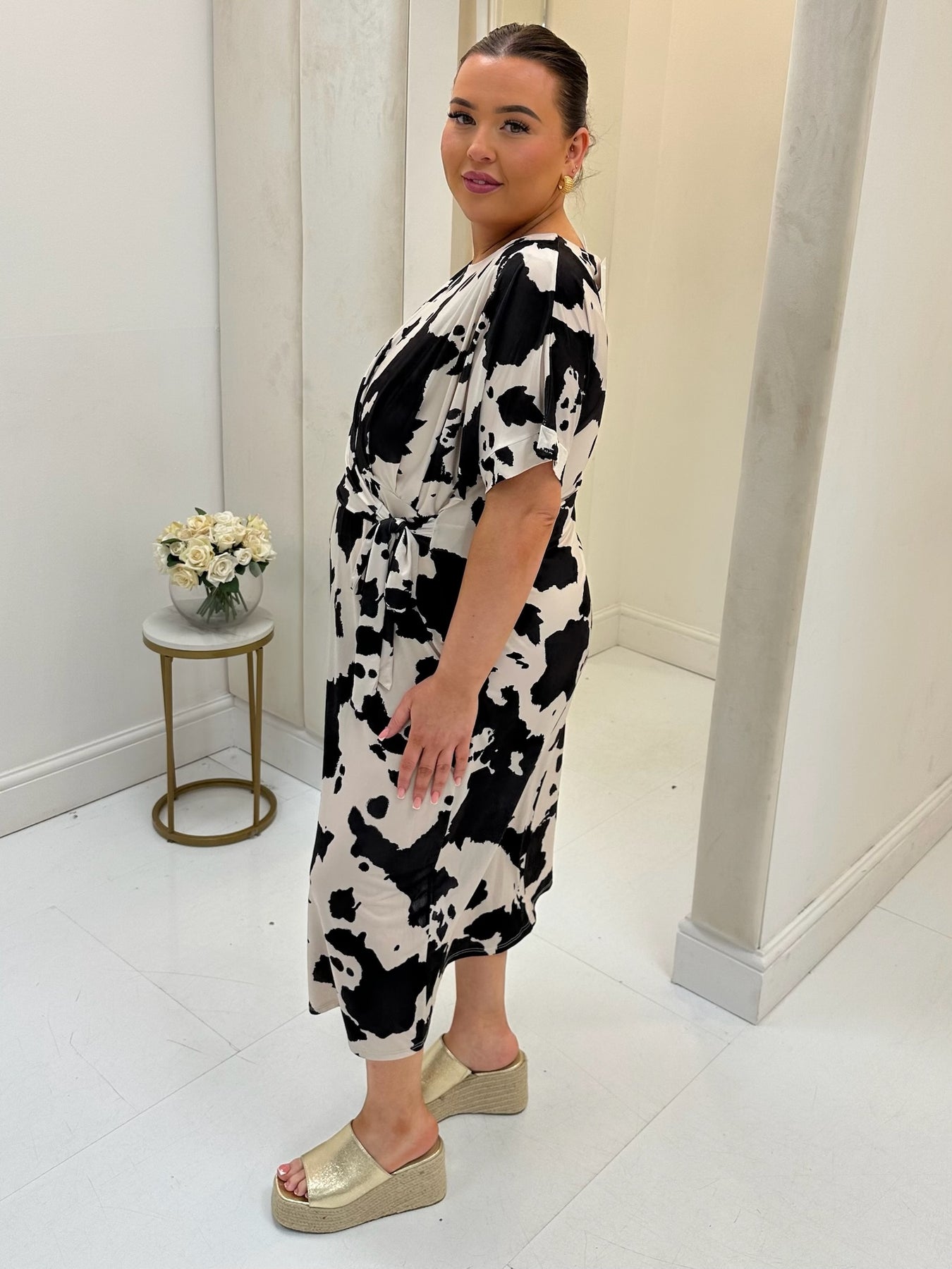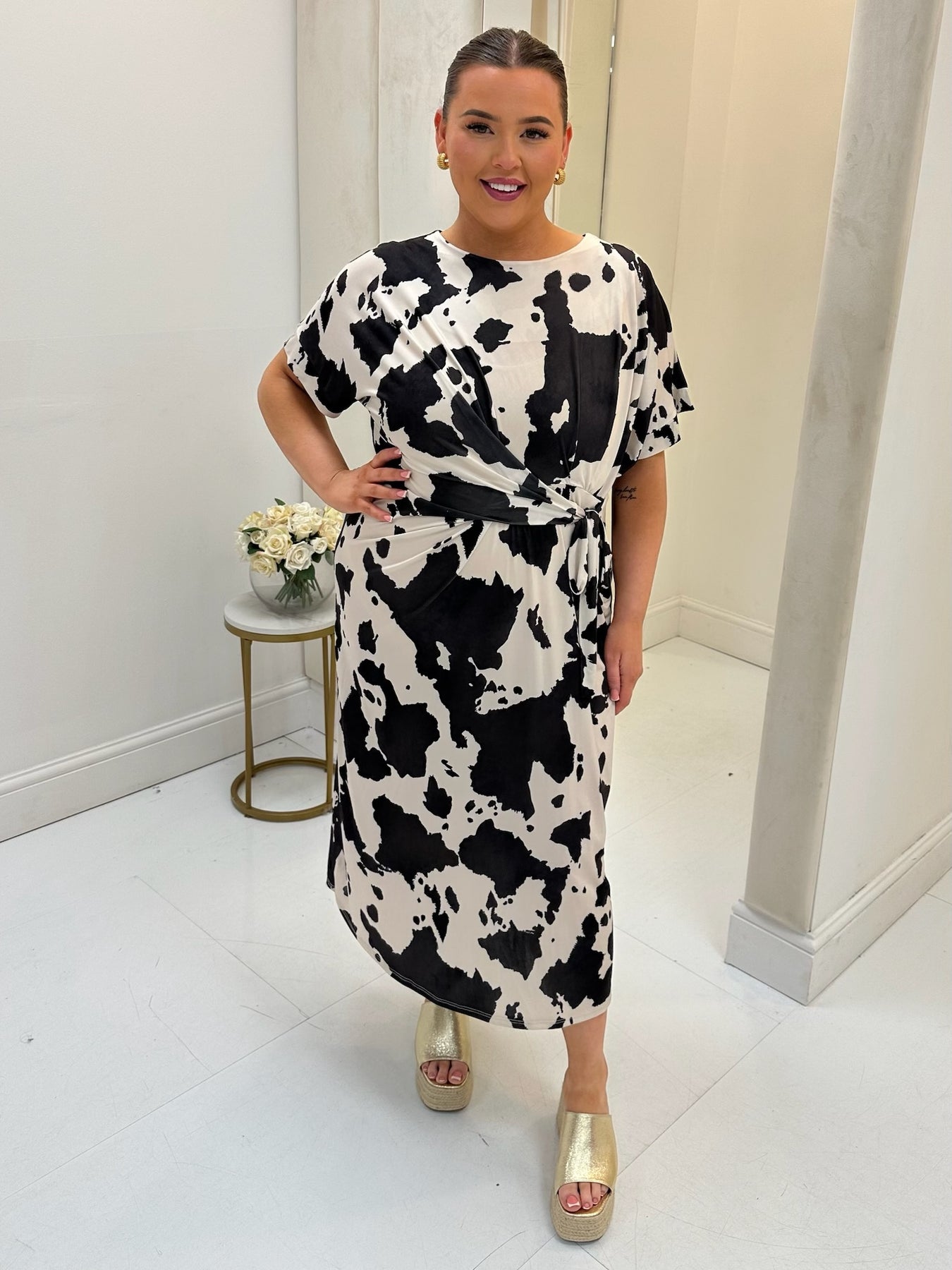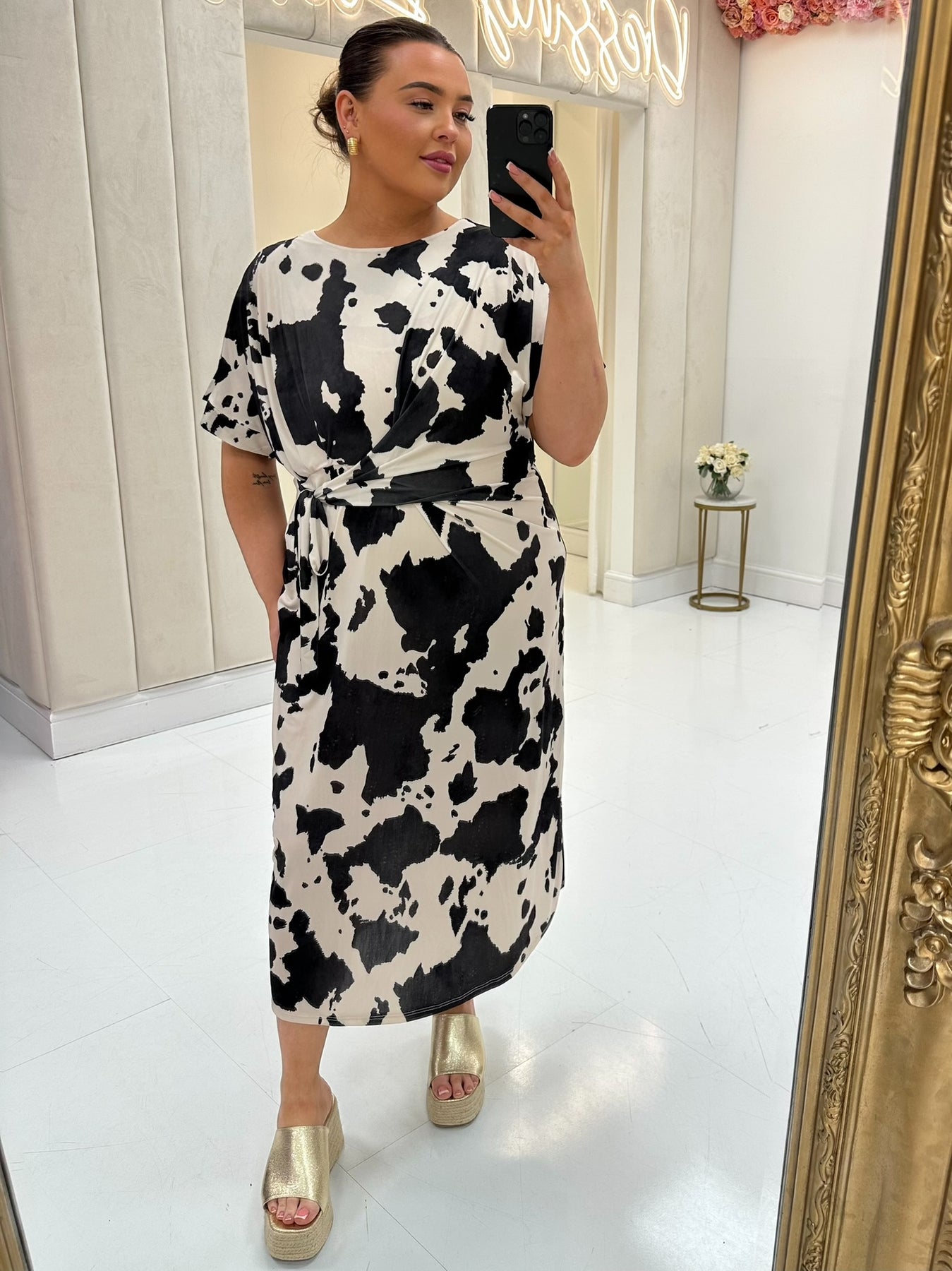 Raven Charcoal Black Cow Print Tie Side Slinky Midi Dress