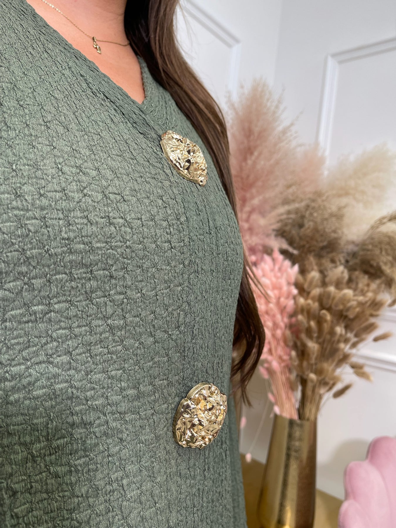 Charlie Khaki Gold Brooch Long Sleeve Trouser Set