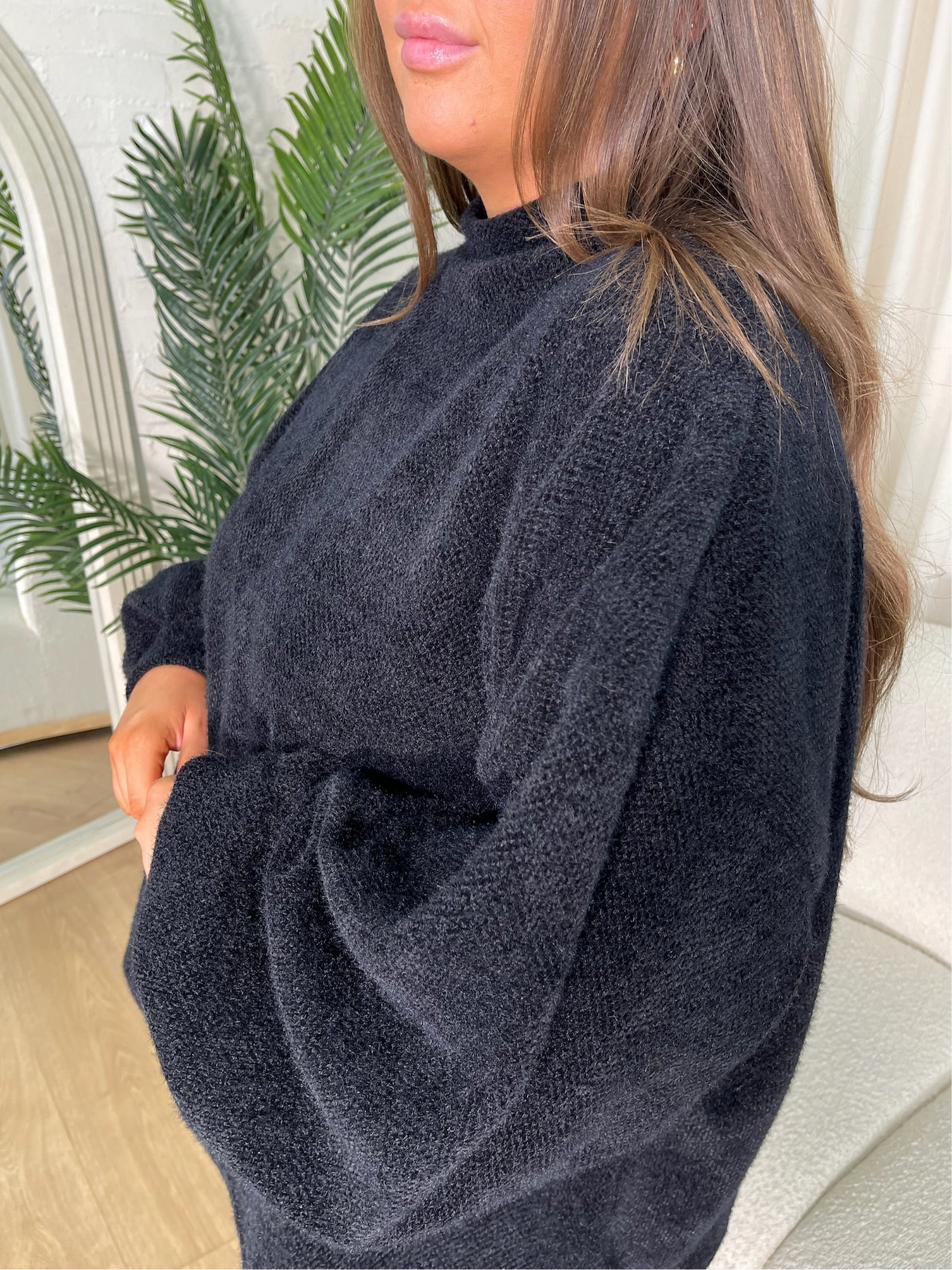 Autumn Black Cosy Knit Fluffy Balloon Sleeve Jumper