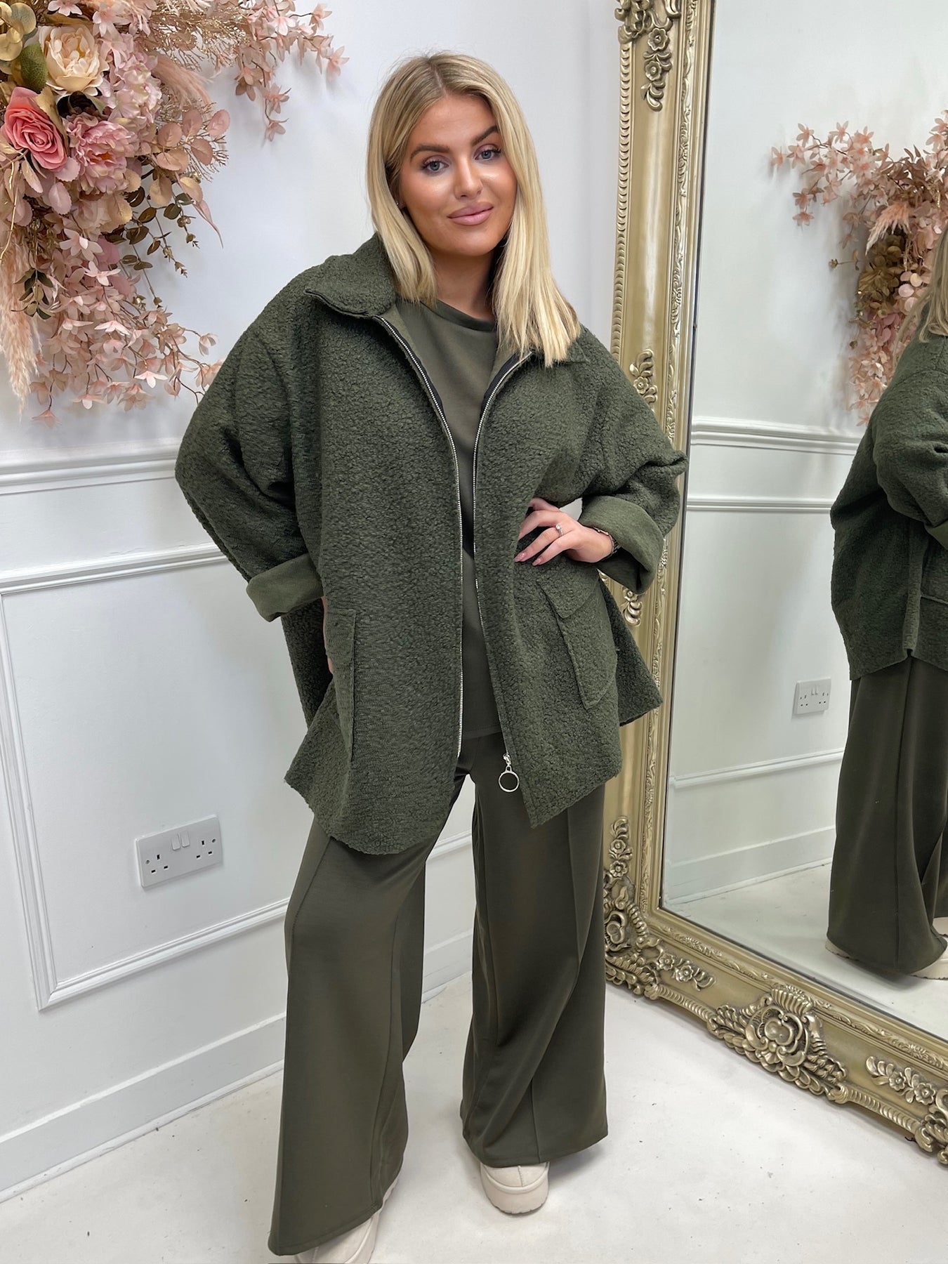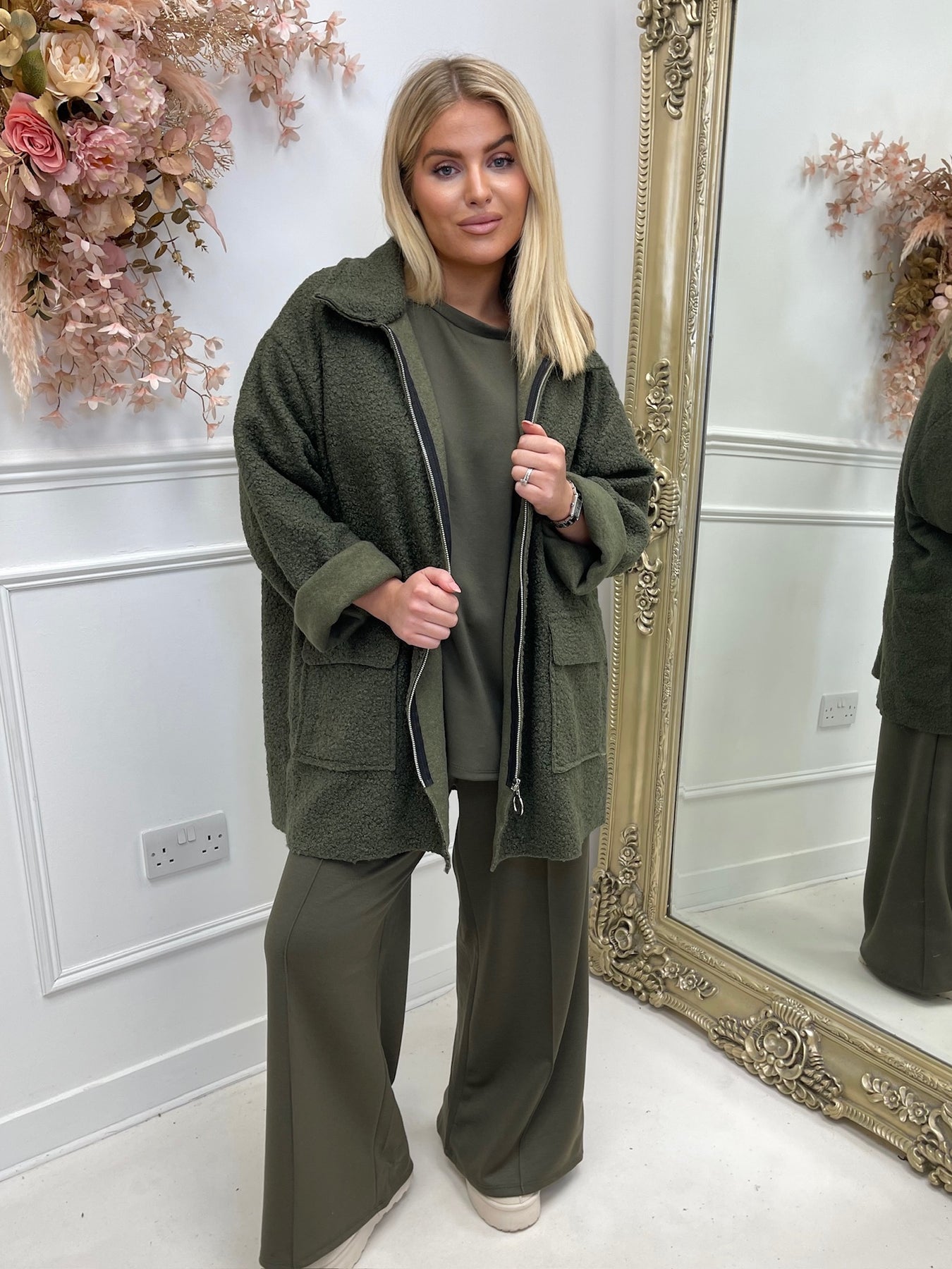 Willow Khaki Zip Up Bouclé Shacket