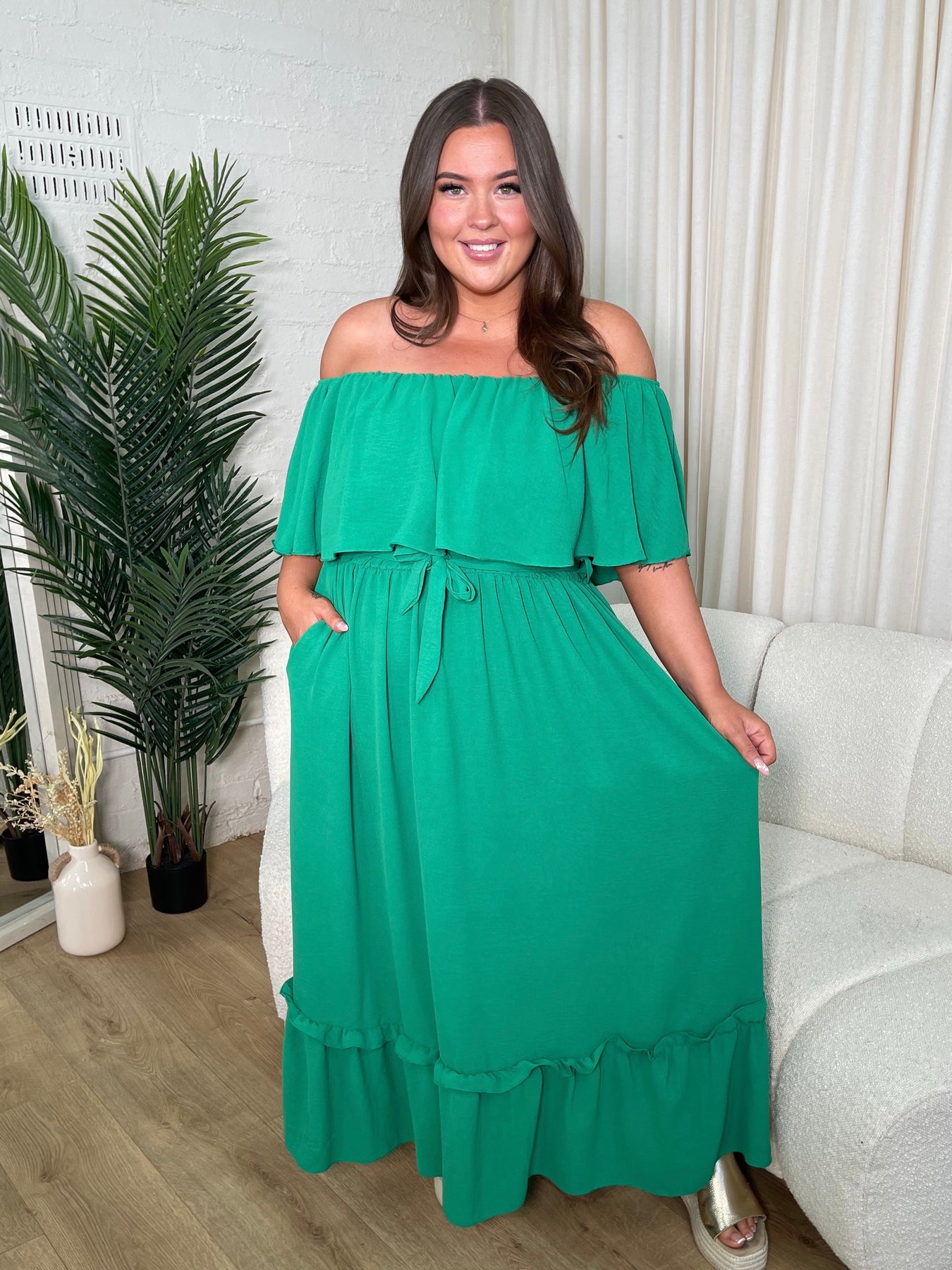 Bella Green Peplum Frill Bardot Dress