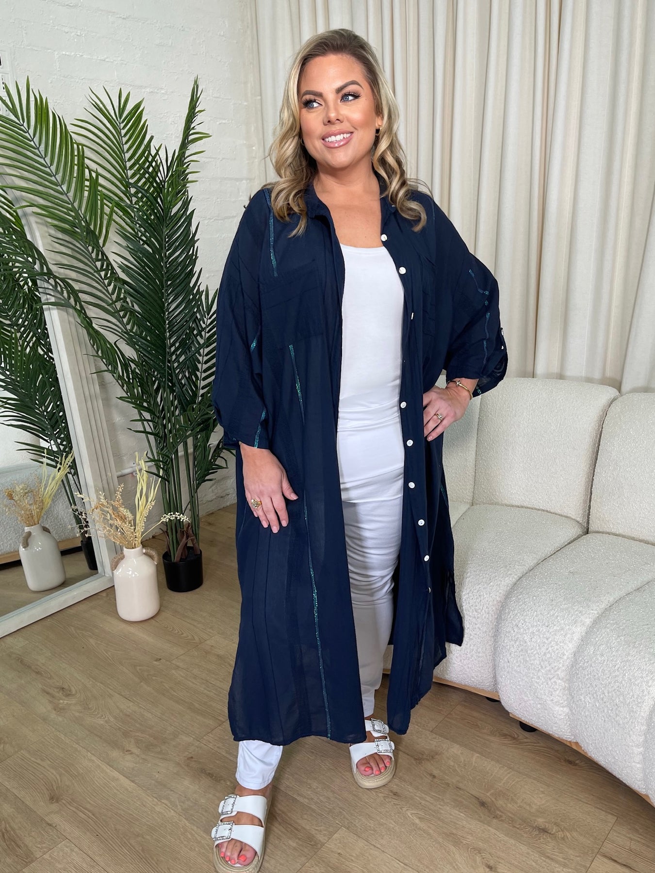 Caitlin Navy Sparkle Stripe Longline Shirt Dress