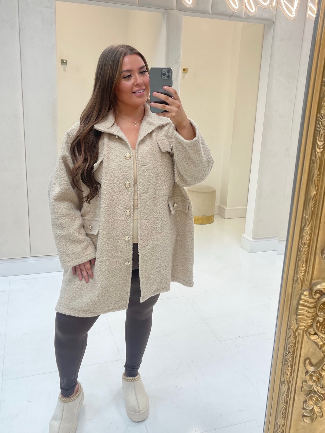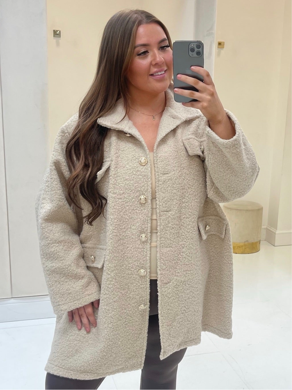 Toni Beige Boucle Gold Button Shacket